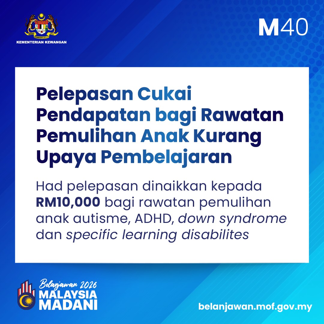 Kerajaan akan terus memastikan kesejahteraan golongan M40 terjaga melalui bantuan kewangan dan subsidi, pelbagai pengecualian cukai individu, serta memudah cara urusan menunaikan haji bagi individu berkelayakan.